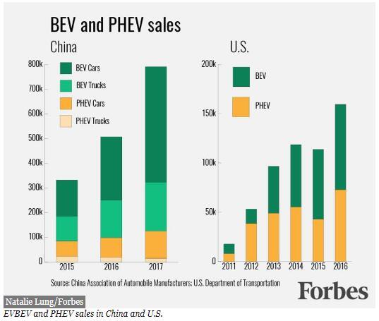 插電式電動(dòng)車(BEV)是唯一真正的全電動(dòng)汽車,其后是插電式混合動(dòng)力電動(dòng)汽車(PHEV)——基本上只是帶電源線的混合動(dòng)力車。盡管PHEV早期在美國(guó)的插電式市場(chǎng)占據(jù)主導(dǎo)地位,而且仍占美國(guó)所有插電式汽車銷售的近一半,但全電動(dòng)BEV在中國(guó)占主導(dǎo)地位。它們?cè)谥袊?guó)商用車領(lǐng)域占據(jù)優(yōu)勢(shì),PHEV正在迅速消失。
